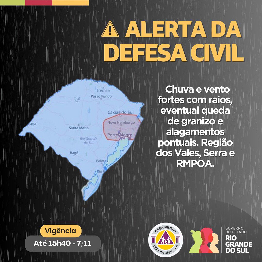 Alerta vale até as 15h40 desta quinta-feira, 7 de novembro A Defesa Civil alerta a população para a chegada de um período de instabilidade climática nas próximas horas, com previsão de chuva intensa, ventos fortes acompanhados de raios e risco de queda de granizo em algumas regiões.