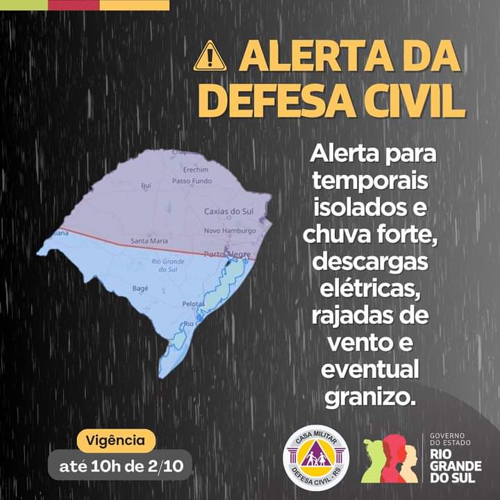 O fenômeno poderá ser acompanhado de descargas elétricas, rajadas de vento e eventual queda de granizo. A Defesa Civil emitiu um alerta válido até as 10h de quarta-feira, 2 de outubro, sobre a possibilidade de temporais isolados e chuva forte em diversas regiões.