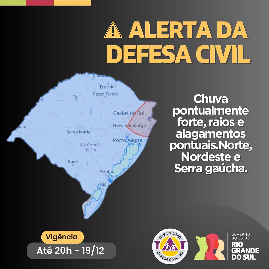 A Defesa Civil do Rio Grande do Sul emitiu, nesta quinta-feira (19), um alerta para a possibilidade de chuvas intensas, acompanhadas de raios e alagamentos pontuais, nas regiões Norte, Nordeste e Serra Gaúcha. O aviso é válido até as 20h.