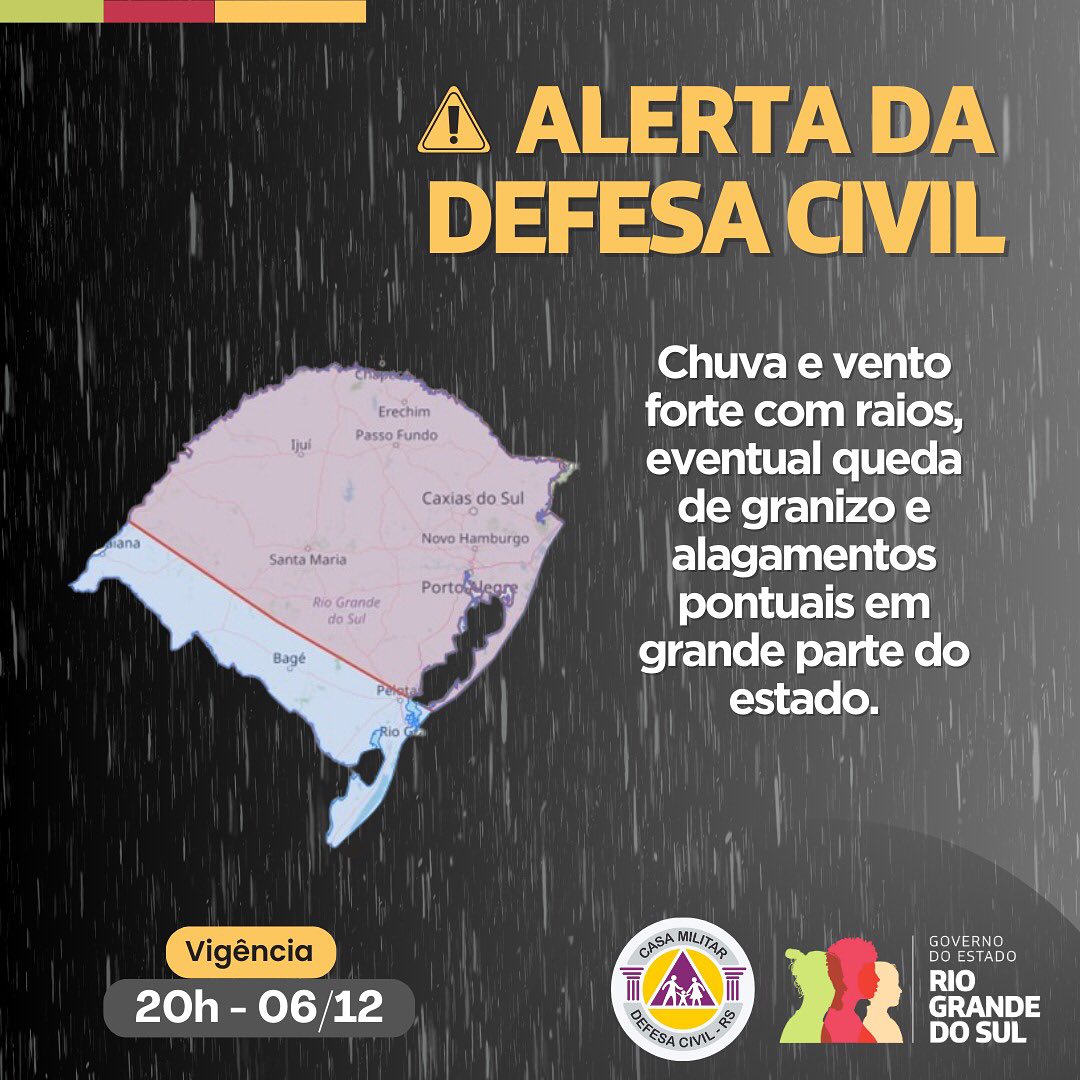 A Defesa Civil emitiu um alerta para condições de tempo severo que incluem chuva forte, raios, temporais isolados, possibilidade de granizo e alagamentos pontuais. A recomendação é de atenção redobrada para toda a população até as 20h desta sexta-feira (6).