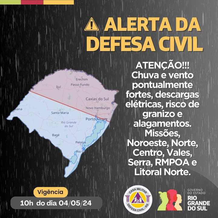 Alerta vale até as 10 horas deste sábado A Defesa Civil emitiu um alerta para a possibilidade de chuvas intensas, ventos fortes, descargas elétricas, risco de granizo e alagamentos para as regiões das Missões, Noroeste, Norte, Centro, Região Metropolitana de Porto Alegre, Vales, Serra e Litoral Norte.