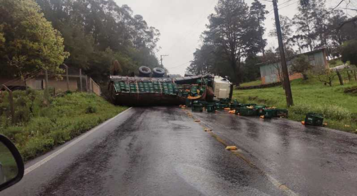 Até às 9h30 desta quinta-feira, o veículo seguia caído no local, bloqueando a rodovia. A carga de tomates estava espalhada pela pista. Apesar do transtorno, ninguém ficou ferido.