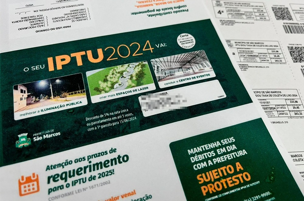Os contribuintes têm a possibilidade de parcelar o pagamento em até cinco vezes, com vencimentos mensais até outubro. A Prefeitura de São Marcos começou a distribuir os carnês do Imposto Predial e Territorial Urbano (IPTU) esta semana.