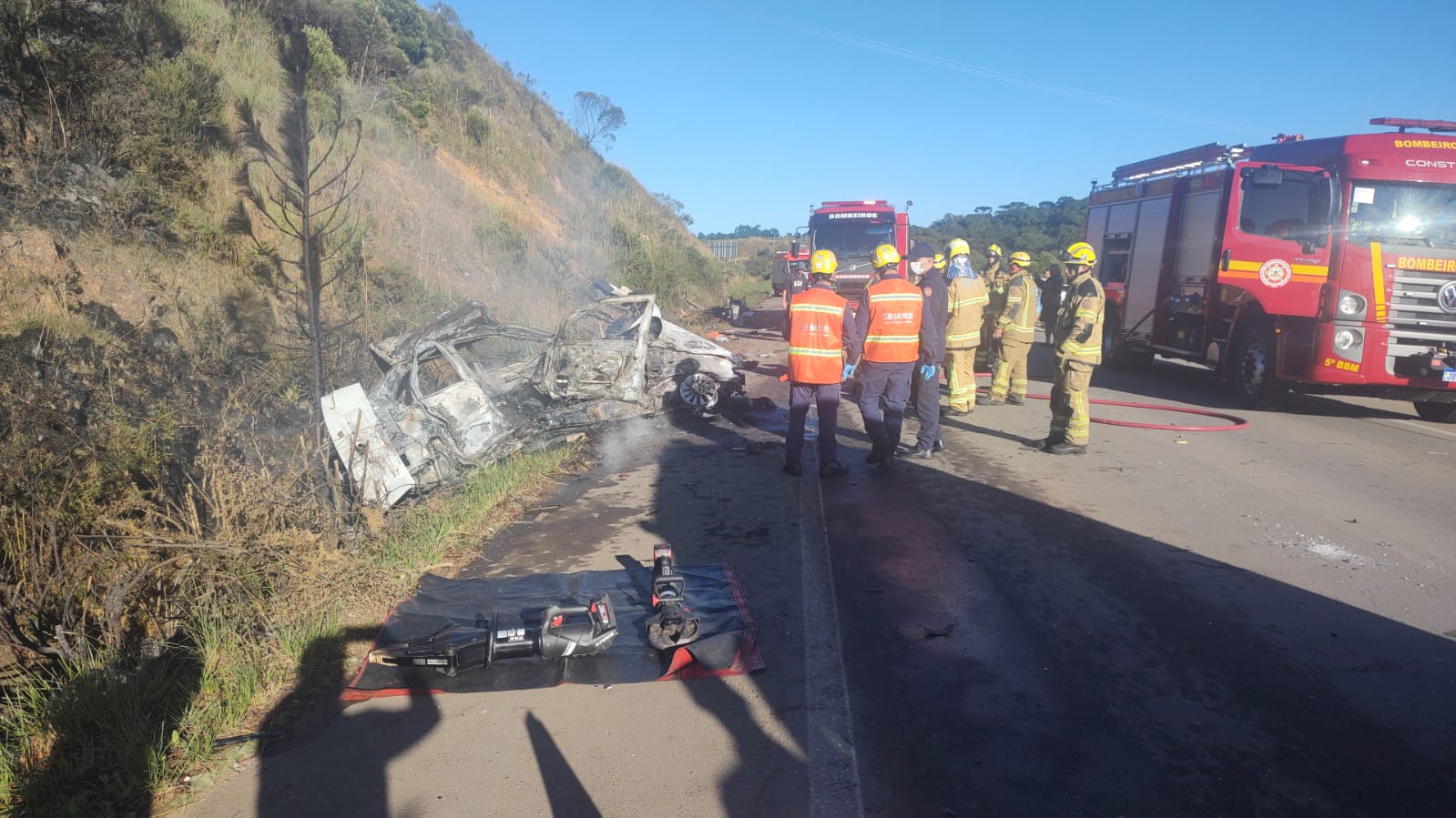 Conforme o Corpo de Bombeiros Militar, a colisão envolveu quatro veículos: um GM Prisma, com placas de Garibaldi, uma caminhonete Fiat Toro e um caminhão Scania, ambos de Caxias, e um VW Polo, emplacado em Uruguaiana, que, com o impacto do acidente, pegou fogo. Um homem, uma mulher e a criança estavam neste carro e morreram carbonizados.