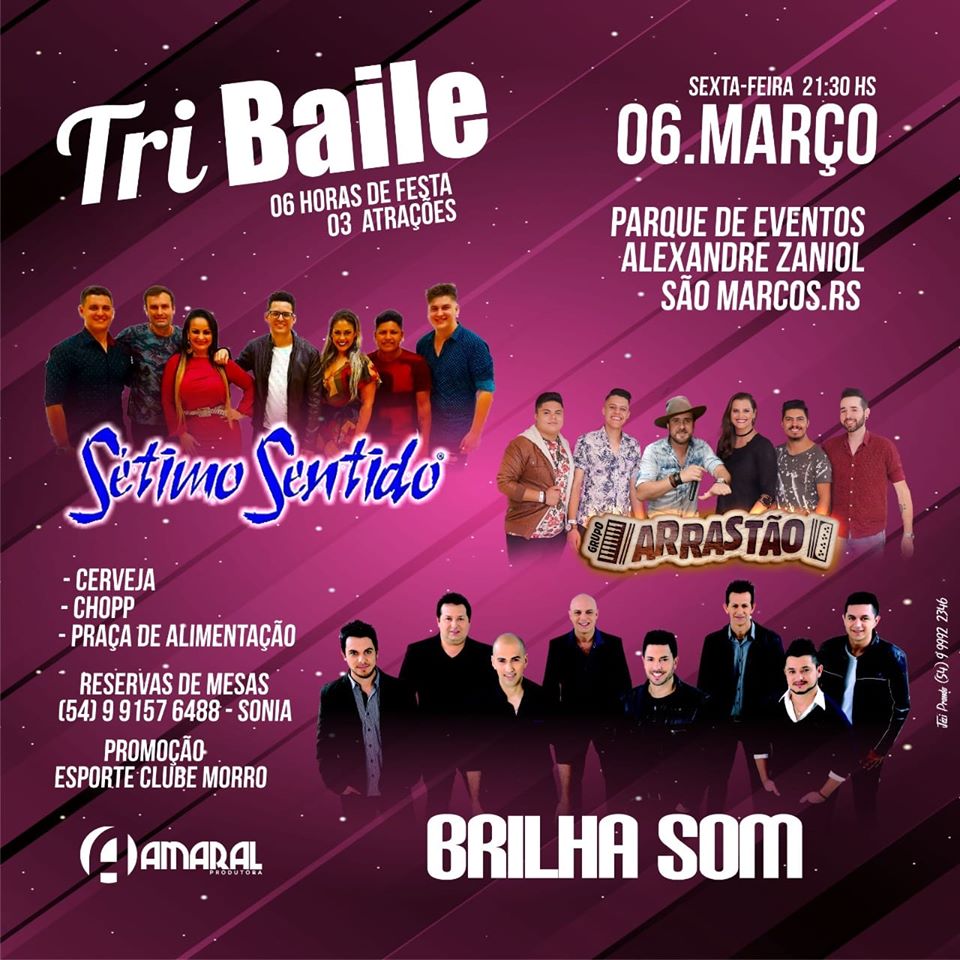 Três atrações comandam 6 horas de festa no Centro de Eventos Alexandre Zaniol. Ingressos custam R$ 30 O Esporte Clube Morro promove uma noite repleta de música boa e diversão com as bandas Sétimo Sentido, Grupo Arrastão e Brilha Som. O evento acontece no dia 6 de março no Centro de Eventos Alexandre Zaniol.
