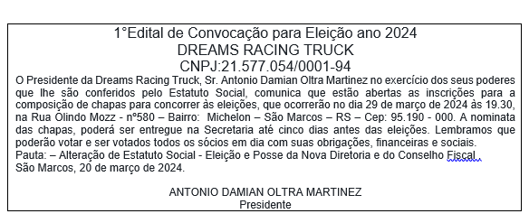 Edital de Convocação para eleição ano 2024 Dreams Racing Truck . Atualizado em 20/03/2024 às 10:03, por Equipe SMO. serragaucha Leia também: Inovação Vacina contra a COVID-19 pode potencializar tratamento contra câncer Pesquisa americana aponta que a tecnologia usada nos imunizantes pode ser uma aliada mente Sabia que existe o luto prolongado? Especialista faz alerta dos sinais e quando buscar ajuda Inovação Unisaúde lança minissérie para pacientes hipertensos em parceria com o Dante Pazzanese Projeto transforma a sala de espera em um espaço de aprendizado sobre prevenção, autocuidado e controle da pressão arterial Tratamentos Cuidado com os seus olhos ao usar "lentes do Halloween" Dr. Leôncio Queiroz Neto faz alerta de cegueira