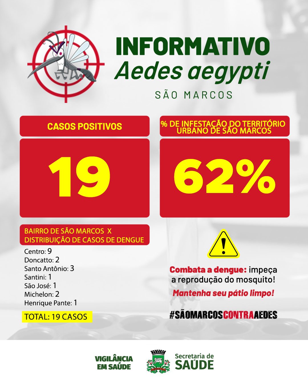 No fim de semana uma mulher de 34 anos passou pelo Hospital São João Bosco e hoje segue internado um homem de 26. Cidade contabiliza 19 casos de dengue conforme último relatório.