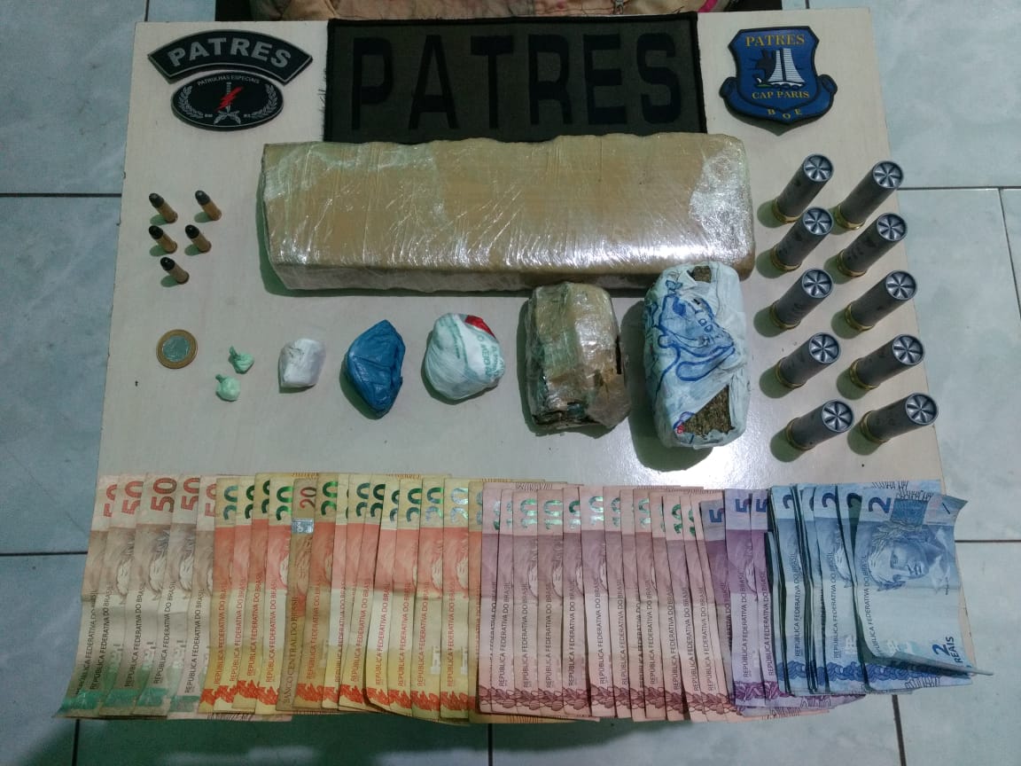 Com ele foram encontradas 41g em pedras de crack e 6g de cocaína, além de 3 tijolos de maconha, totalizando 1,3kg da droga. Também foi apreendida uma quantia em dinheiro, somando R$ 736, além de 5 munições de revólver calibre 32 e 5 munições de espingarda calibre 12.