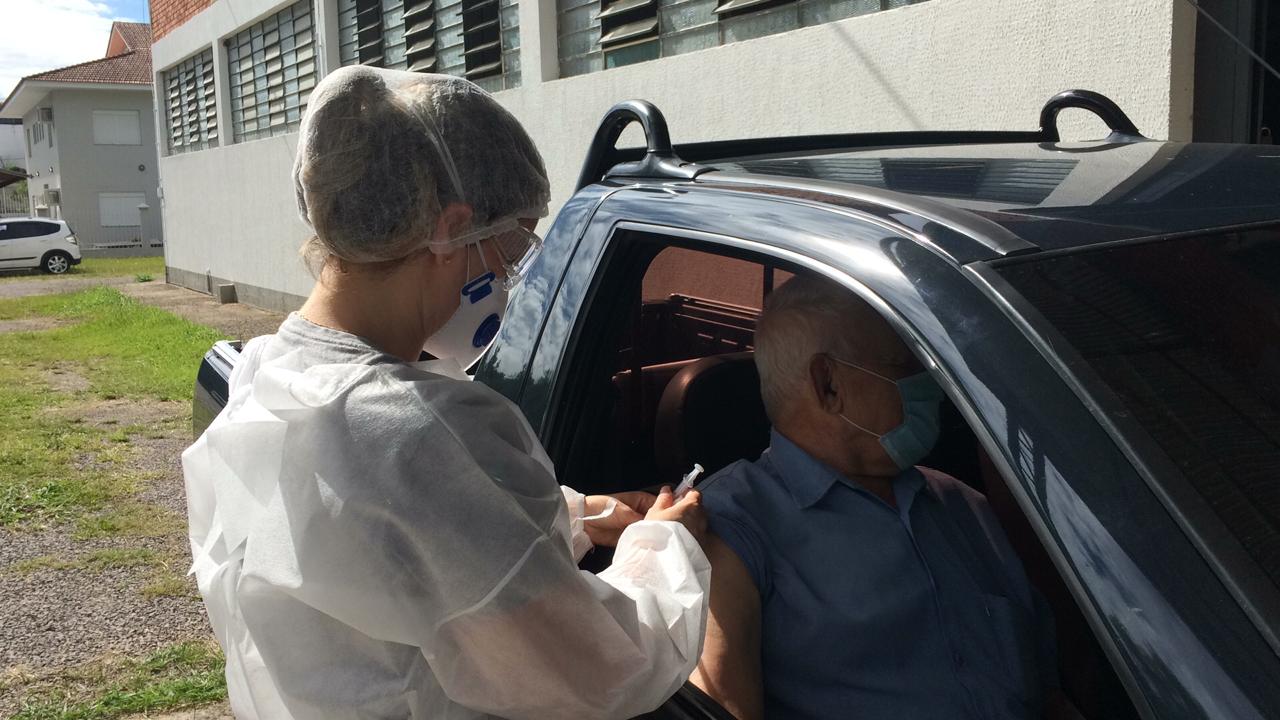 Conforme a secretaria de saúde do município, a ação para vacinar idosos de 74 anos está sendo realizada nesta segunda-feira no Centro de Eventos Alexandre Zaniol, até as 11h30.