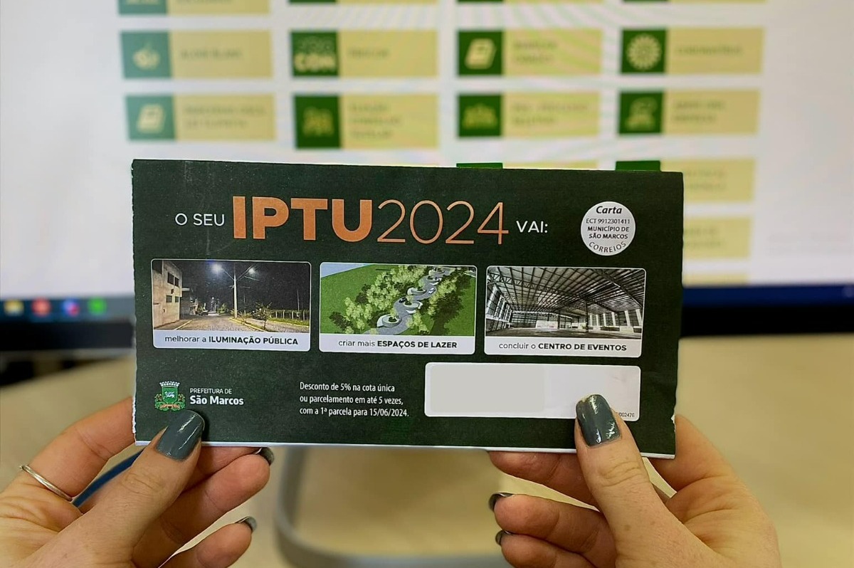 Carnês estão sendo distribuídos pelos Correios e também podem ser impressos no site da prefeitura. Pagamentos em cota única terão 5% de desconto A Prefeitura de São Marcos está distribuindo os carnês do Imposto Predial e Territorial Urbano (IPTU).