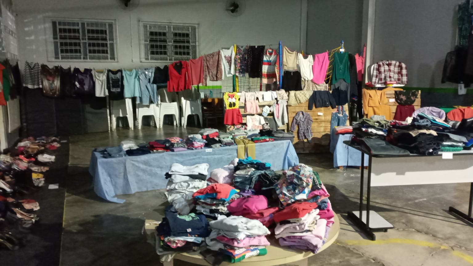 Peças de roupas e calçados, adulto e infantil, podem ser encontrados a preços que variam de R$ 1 a R$ 15. Ação acontece no pavilhão da escola