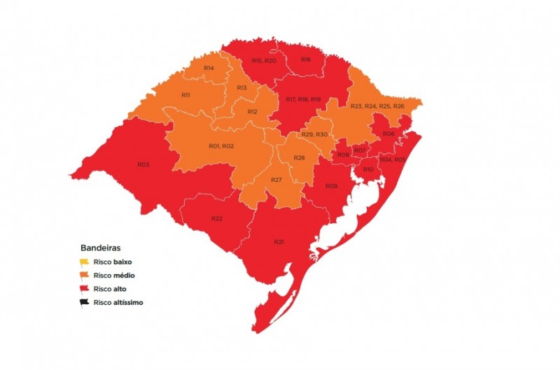 Guaíba, inclusive, é uma das 12 classificadas como risco epidemiológico alto na versão preliminar do mapa, ao lado de Capão da Canoa, Palmeira das Missões, Erechim, Pelotas, Bagé e Uruguaiana. As regiões de Novo Hamburgo, Porto Alegre, Canoas, Taquara e Passo Fundo já estavam na bandeira vermelha na 13ª rodada e foram mantidas. A região de Lajeado apresentou melhora nos indicadores e reduziu para a bandeira laranja.
