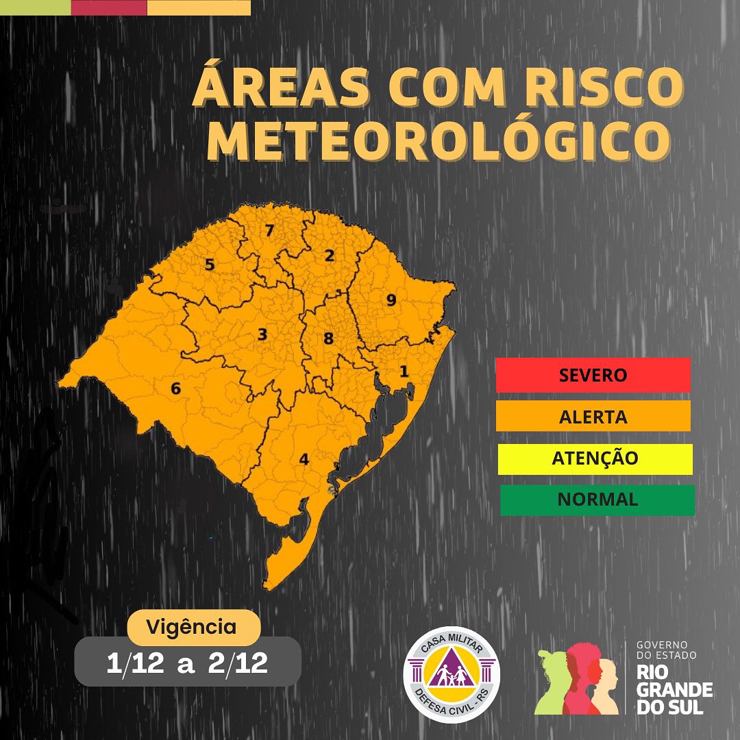 Na segunda-feira (2), as tempestades avançam para a metade Norte do estado, onde acumulados podem atingir entre 60 e 100 mm/dia no Noroeste e Norte. Já nas regiões Centro, Vales, Região Metropolitana de Porto Alegre (RMPOA), Serra e Litoral Norte, os volumes devem ficar entre 30 e 60 mm/dia, com ventos chegando a 90 km/h. O cenário se estabiliza ao longo da noite, com o afastamento da frente fria.