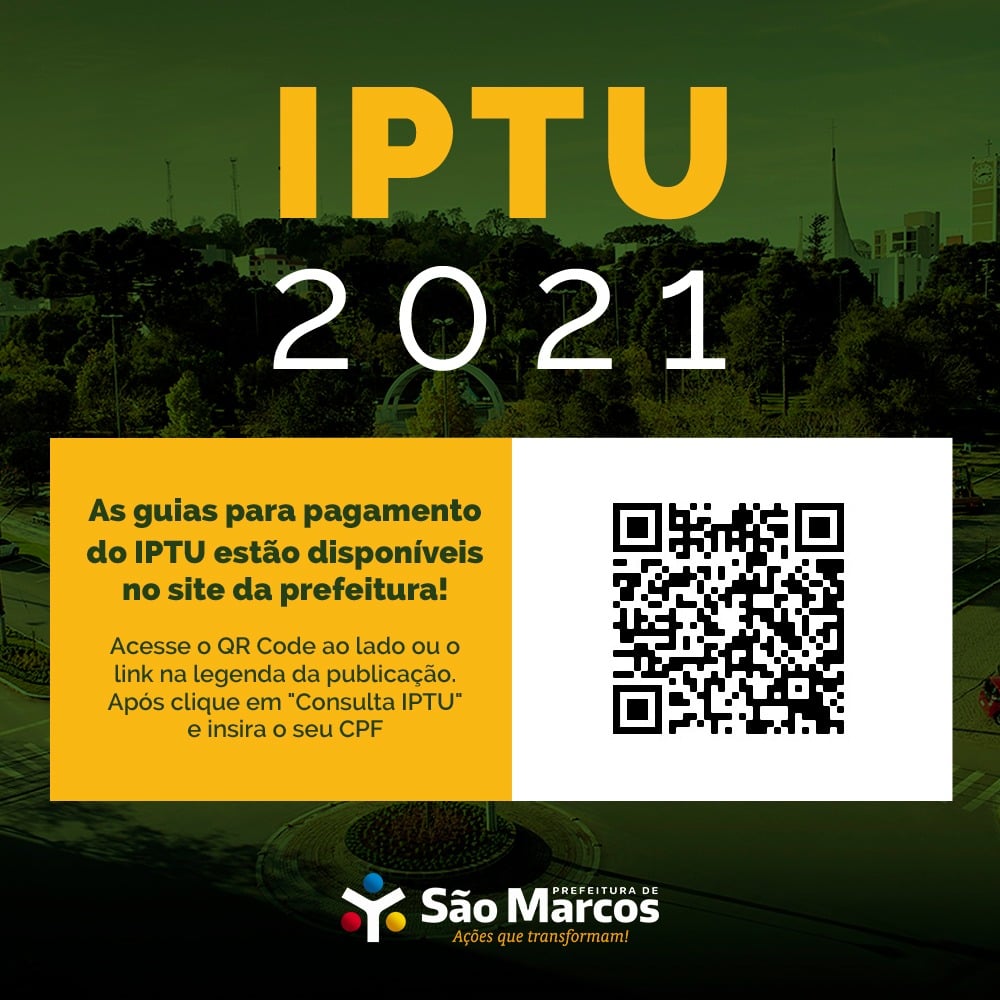 Contribuintes podem pagar em cota única neste dia 15 com 5% de desconto. Pagamento deve ser efetuado apenas nos bancos e as guias podem ser acessadas através do QR Code na imagem A prefeitura de São Marcos inicia hoje a cobrança do Imposto Predial e Territorial Urbano (IPTU).