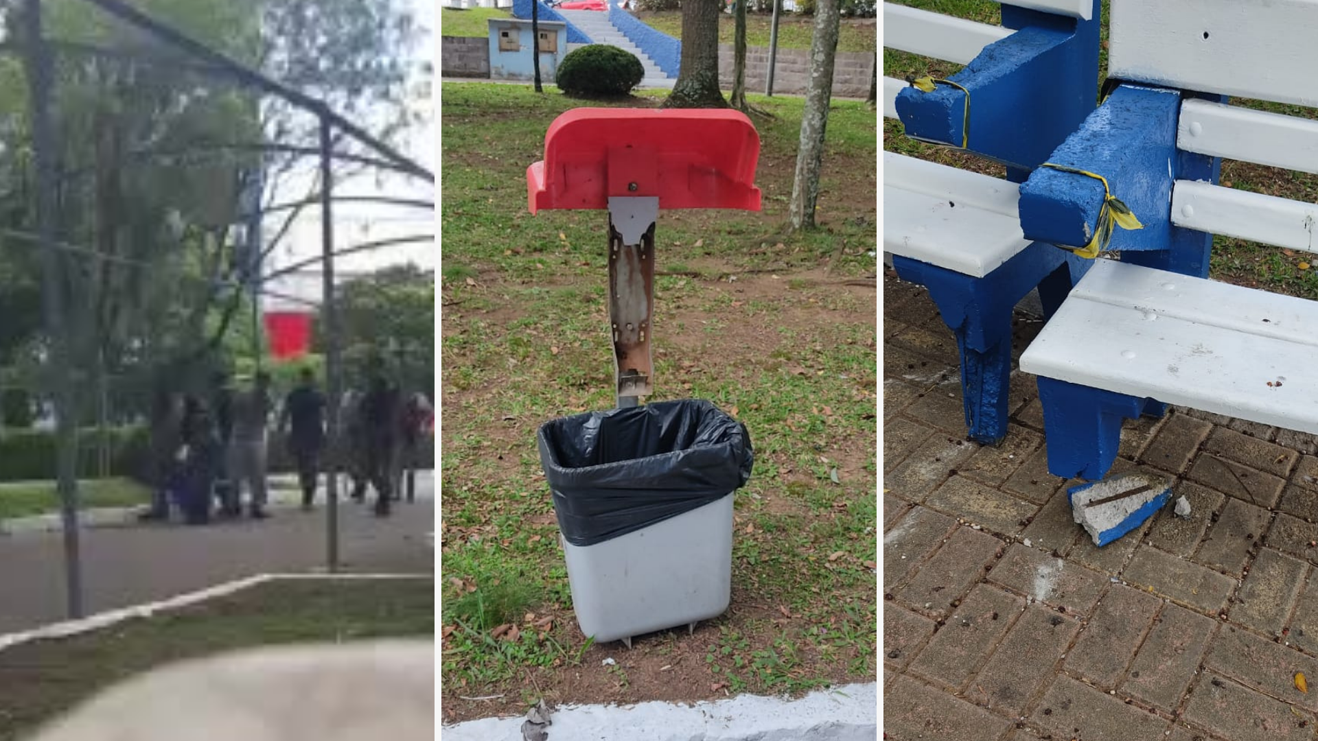 Segundo registros, mais de 15 bancos foram virados e um deles foi quebrado e de acordo com funcionários da prefeitura que estavam no local, duas lixeiras também foram danificadas.