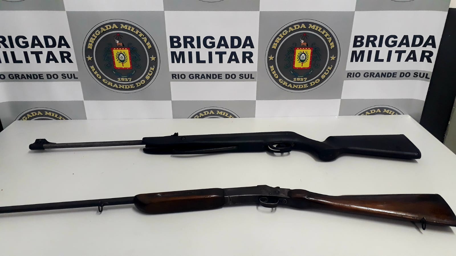Já em revista ao veículo a guarnição localizou no porta malas do automóvel uma espingarda cal. 36 marca Rossi e e uma espingarda de pressão 4.5 marca CBC. O condutor assumiu ser o proprietário, porém, em consulta ao sistema, foi constatado que ele não possui nem registro e nem porte das armas.