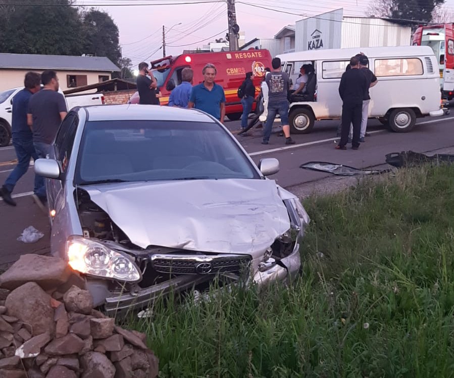 Uma colisão frontal deixou quatro pessoas feridas no km 114 da BR 116, em São Marcos. O acidente envolveu uma Kombi, com placas de Igrejinha/RS, que seguia em direção ao centro e um Corolla, com placas de São Marcos, que seguia em direção ao bairro Michelon.