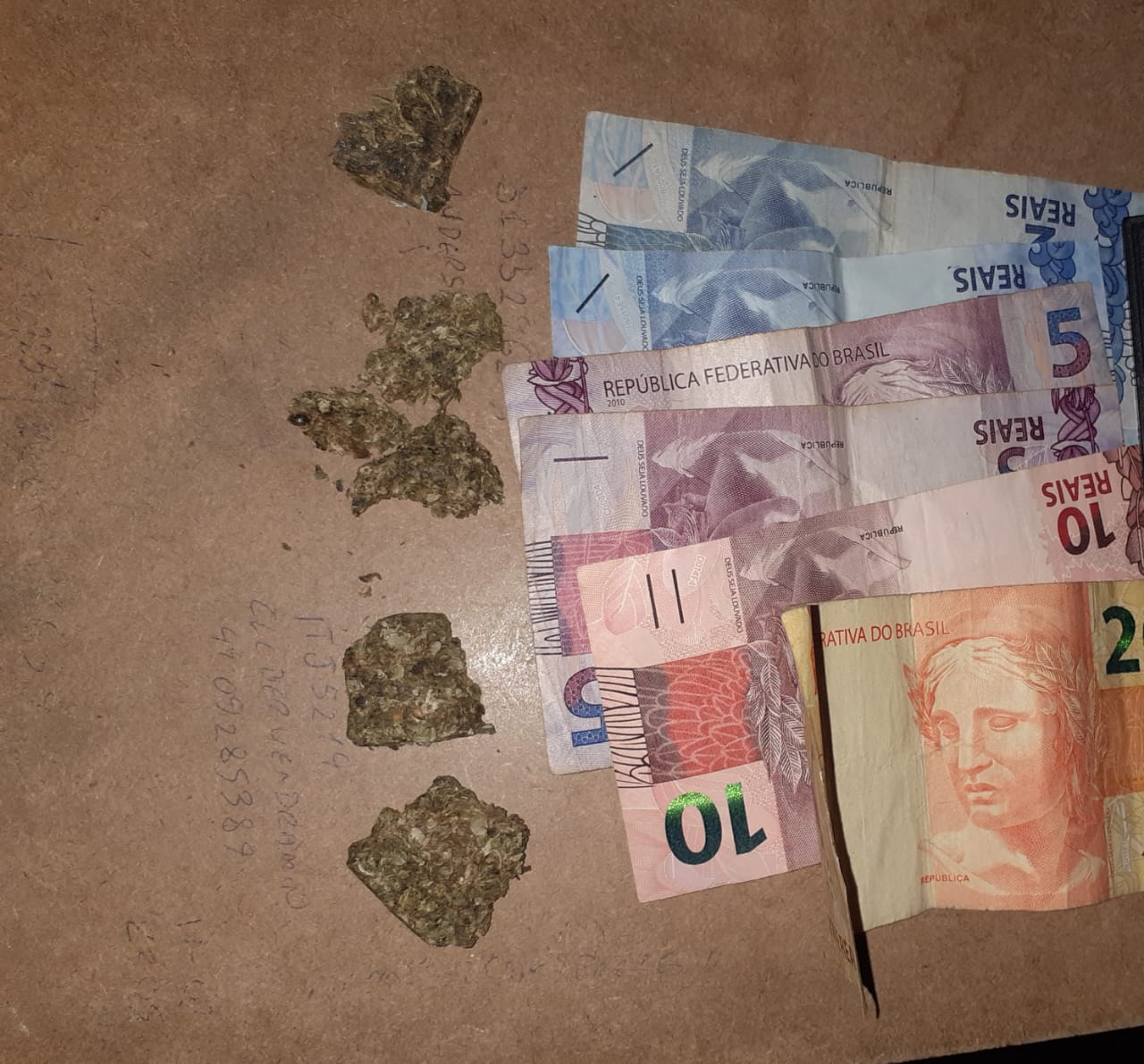 Diante das informações a guarnição abordou o referido veículo saindo deste local e que em revista pessoal foi encontrado no seu bolso direito da calça um envólucro com aproximadamente 9 gramas de substância característica semelhante a maconha e R$ 44,00 fracionados, uma nota de R$ 20,00, uma nota de R$ 10,00 duas notas de R$ 5,00 e duas notas de R$ 2,00.
