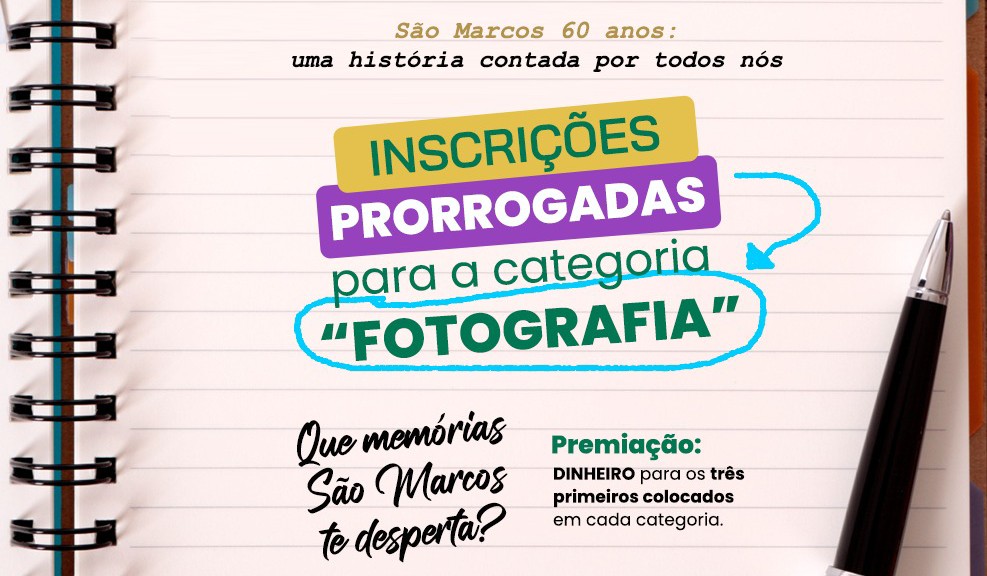 As inscrições para a categoria fotografia, que é a única aberta à comunidade no Concurso de Gêneros Textuais, foram prorrogadas devido à baixa adesão. O tema desta edição é “São Marcos 60 anos: uma história contata por todos nós”, com o objetivo de evidenciar as seis décadas de emancipação política do município.