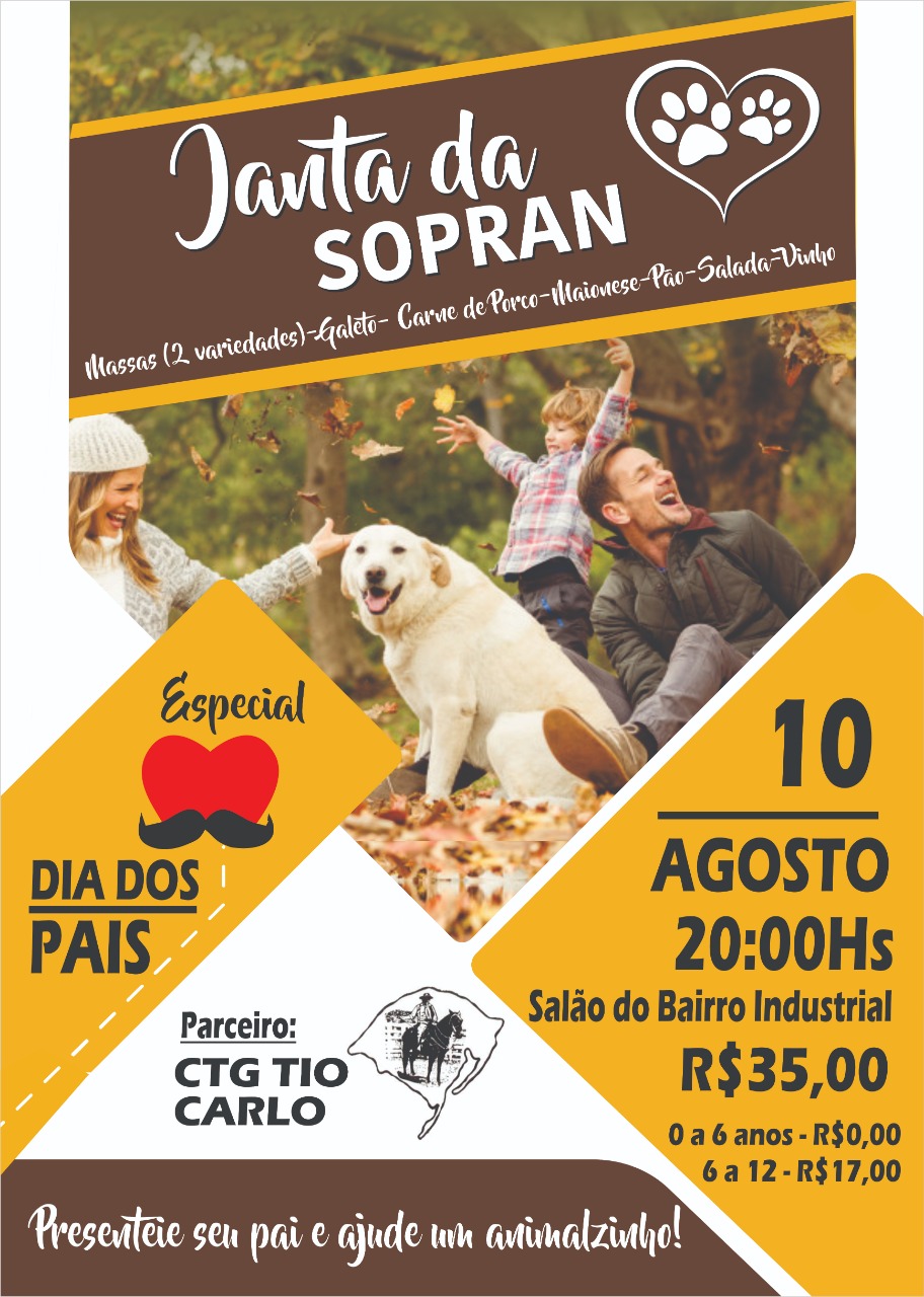 A Sociedade Protetora dos Animais, Sopran de São Marcos, com o apoio do CTG Tio Carlo, promove no dia 10 de agosto, sábado, mais uma edição do jantar beneficente em prol dos animais abandonados. Este ano o evento será realizado no salão do bairro Industrial a partir das 20h.