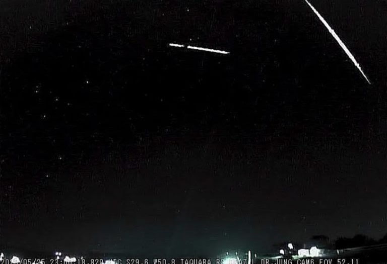 Um meteoro brilhou no céu de Tramandaí, no Rio Grande do Sul, na noite de quinta (25). O objeto deixou um rastro luminoso durante sua passagem, registrado junto de um avião comercial que voava pela região naquele momento com destino a Lisboa, em Portugal.