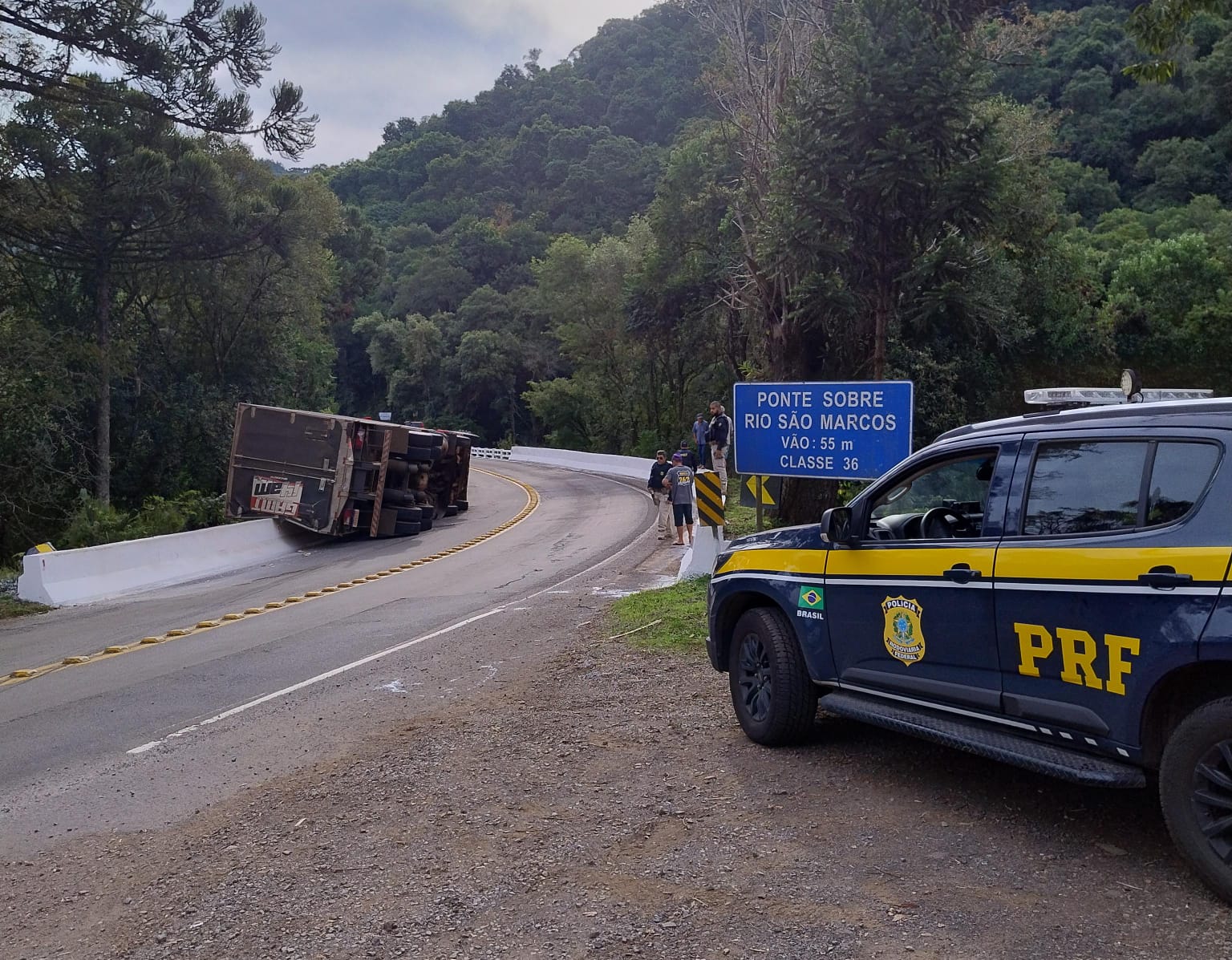 Motorista fica ferido após caminhão tombar na BR-116, na divisa entre São Marcos e Caxias do Sul