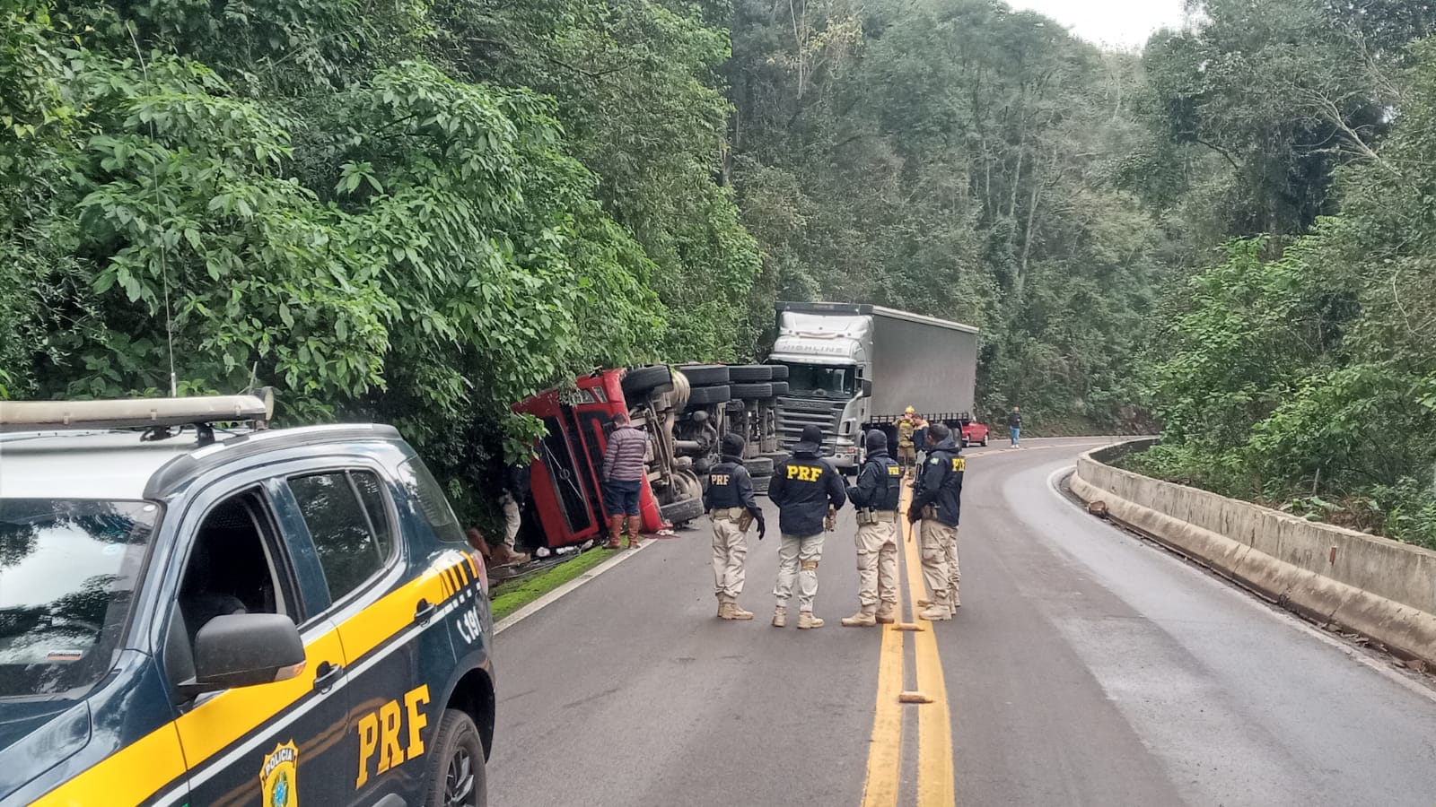 Motorista tem ferimentos leves após carreta tombar na BR-116 entre São Marcos e Campestre