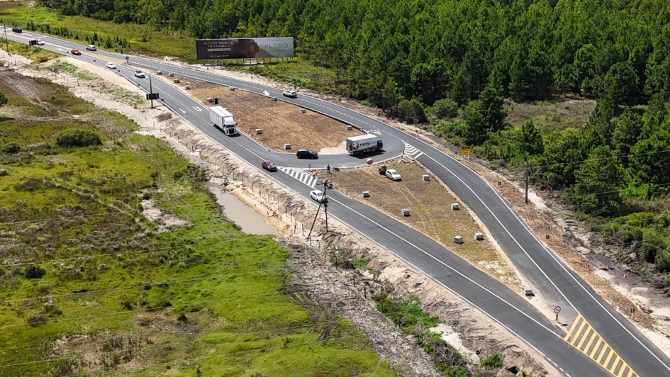 Alteração no tráfego foi realizada no entroncamento com a Interpraias, em Osório. Com a nova configuração de rótula fechada, o trânsito agora é feito contornando a interseção, permitindo retornos sem a necessidade de cruzar o tráfego ativo. A circulação de veículos em um dos trechos mais movimentados do Litoral Norte está mais dinâmica e segura.