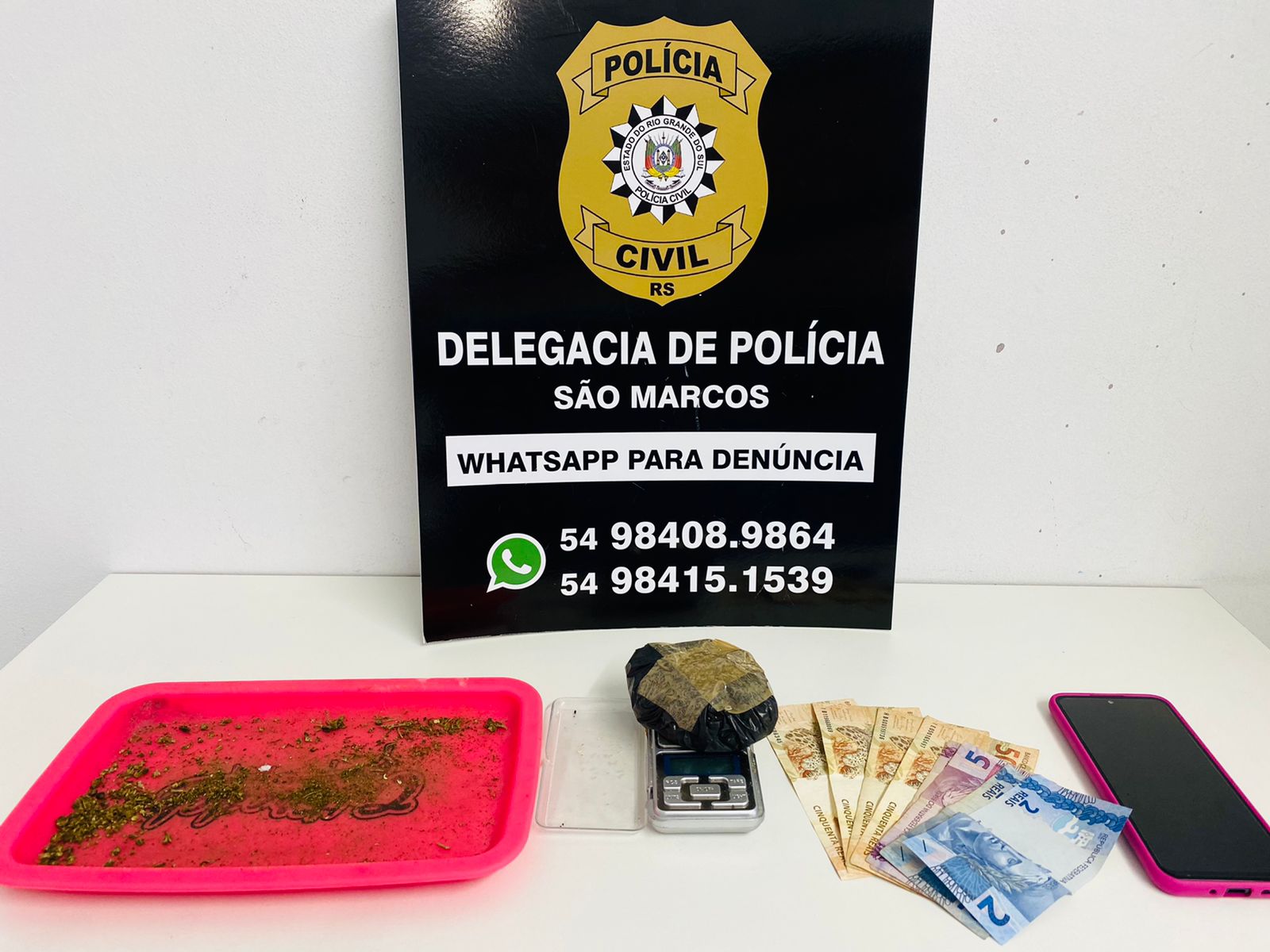 Na manhã desta sexta-feira (03) a Polícia Civil de São Marcos prendeu uma mulher de 29 anos após após investigações relacionadas ao crime de tráfico de drogas, entre outros.