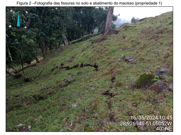 Na propriedade localizada nas coordenadas -28.926940° de latitude e -51.050520° de longitude, nas proximidades da estrada que liga as comunidades das linhas Tiradentes e Zambicari, verificou-se a abertura de fissuras e abatimento do terreno. Apesar de não haver risco imediato para a residência mais próxima, a movimentação de blocos de rocha pode representar perigo. Foi recomendado o monitoramento contínuo da área e evacuação preventiva em caso de agravamento das condições ou de novas chuvas.