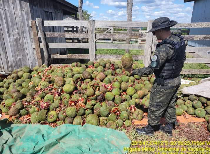 Na manhã desta quinta-feira (14), uma guarnição do 4° Grupo Ambiental de Vacaria através de denúncia deslocou até a localidade da Fazenda Estrela interior do município de Vacaria e constatou o depósito de 17.820 kg “in natura” e sementes prontas para a comercialização.