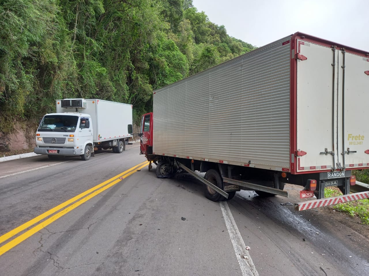 Caminhão teve o eixo dianteiro quebrado após colisão com carro no início da tarde desta quinta-feira próximo a ponte do Rio São Marcos