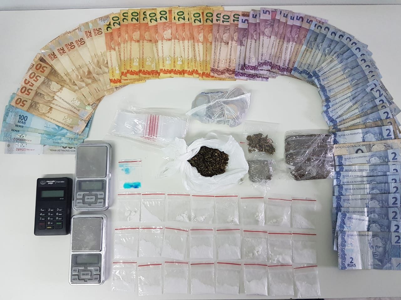 Durante a operação também foi apreendida quantidade substancial de diferentes drogas, além de dinheiro, um veículo e apetrechos para embalagem e separação da droga.