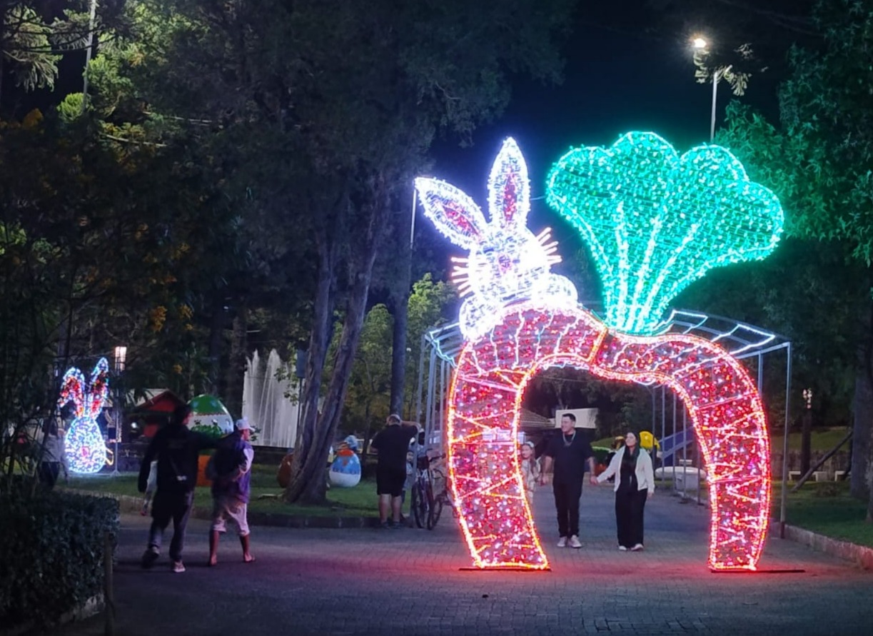 Não faltam também painéis com mensagens especiais, como o que traz a frase “Feliz Páscoa”, em letras iluminadas em amarelo e adornado com cenouras em laranja e verde. Painéis com coelhos escondidos em ovos coloridos ou segurando cenouras também integram o circuito de enfeites, proporcionando um passeio mágico, especialmente ao cair da noite, quando as luzes dão um show à parte.