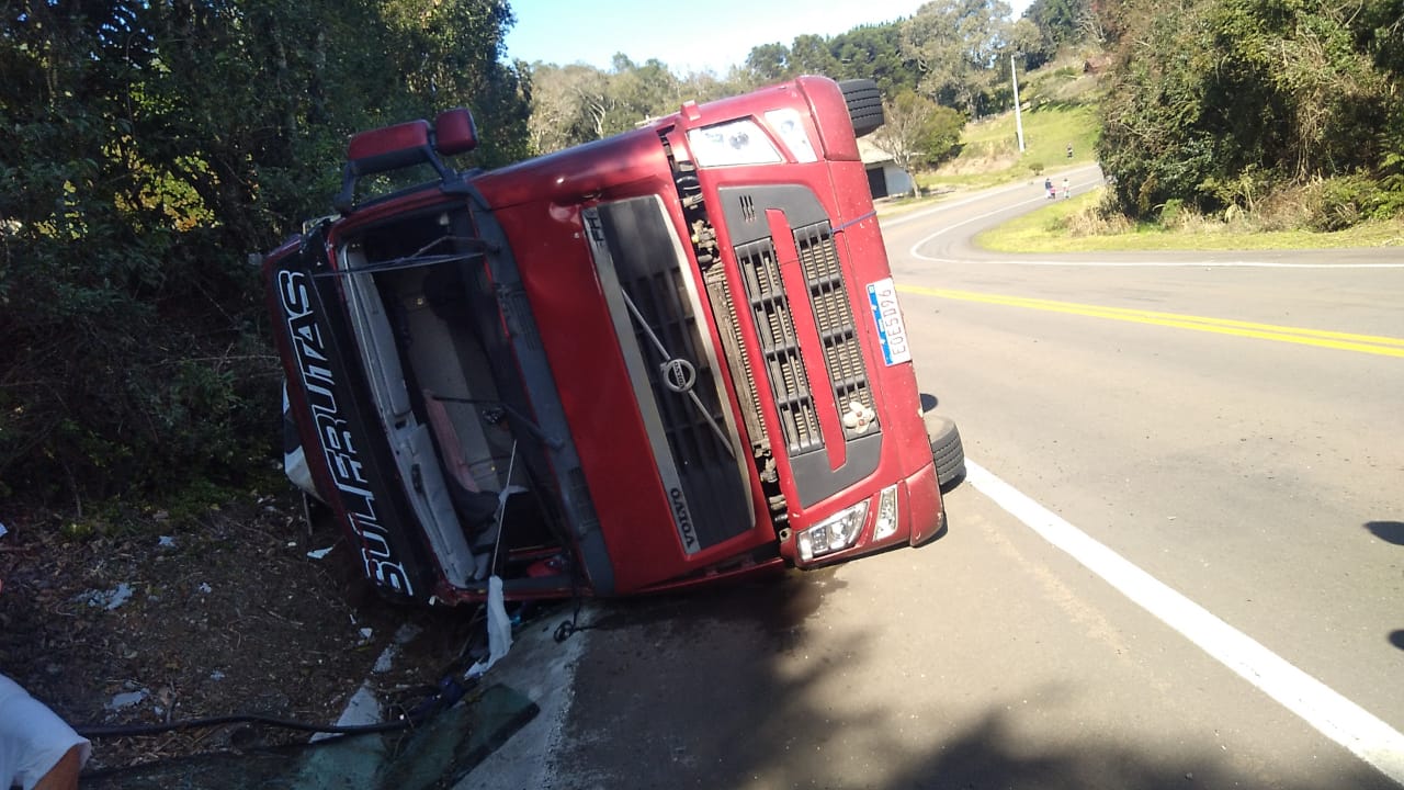 O caminhão com placas Mercosul seguia no sentido São Marcos x Vacaria quando tombou logo após uma curva. Não há informações sobre feridos.