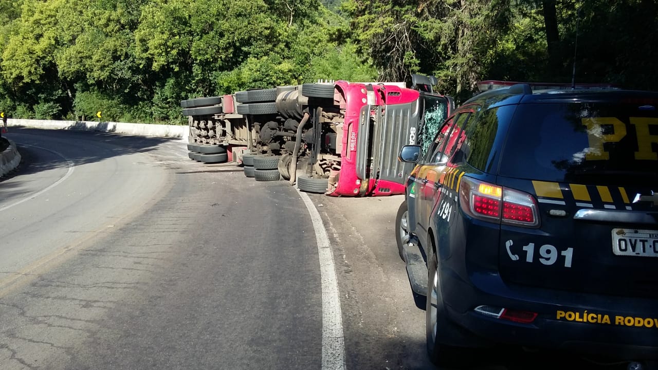Há pouco tempo um caminhão Scania tombou no km 132 da BR-116 sentido São Marcos. Neste momento equipe da PRF está no local orientando o trânsito.