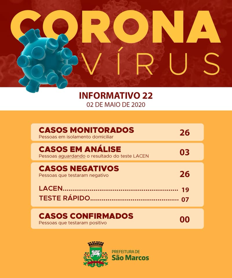 A Prefeitura de São Marcos divulgou nota na noite deste sábado (2) informando que encaminhou mais dois testes ao Laboratório Central do Estado (LACEN). Além destes, outros dois testes rápidos foram feios e tiveram resultados negativos para Covid-19.