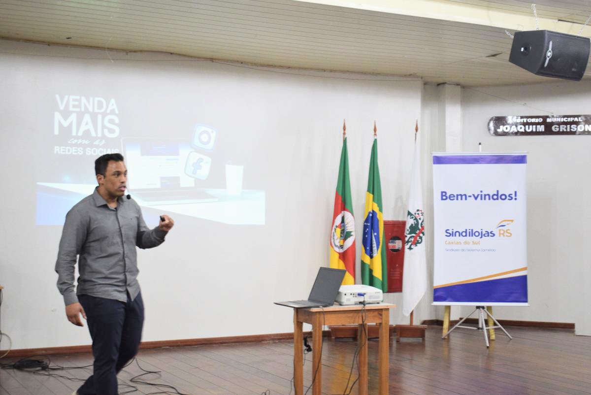 Nesta terça-feira, 28 de junho, o Sindilojas Caxias trouxe o Workshop “Como aumentar as vendas através das redes sociais”, com o especialista em Marketing Digital e Vendas, Evandro Carter, para São Marcos, cidade da base territorial da entidade. O encontro, realizado no auditório da Prefeitura, foi uma oportunidade para reunir empresários do comércio para conhecer como utilizar a internet para vender nas redes sociais.
