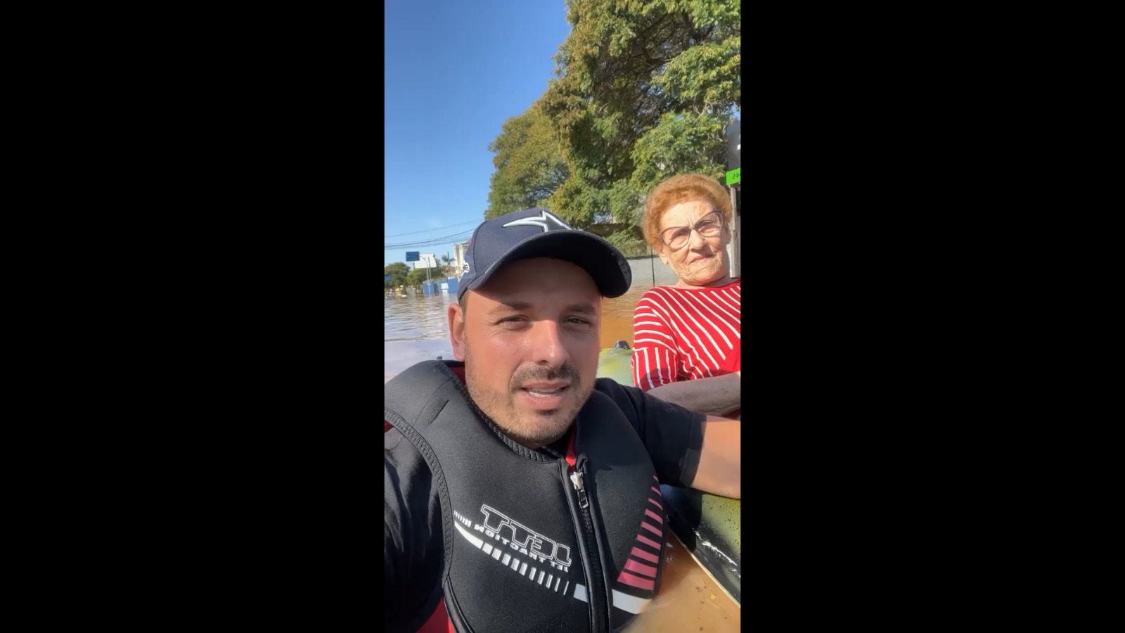 “Teve um momento que a gente estava passando com pessoa em cima da canoa e veio uma senhora na janela. Água, água, estou sem água, me tragam água por favor! Ela estava em um prédio todo cheio de grade e com as correntezas os carros iam todos ali e trancou a porta do prédio. Então ela não conseguia sair pelo prédio, porque tinham os carros nas portas. A gente subiu em cima de um dos carros, ela jogou uma corda lá, um negocinho da janela, conseguimos botar a água dentro de um recipiente lá ela puxou para cima e assim foi. Então o pessoal está improvisando porque muitas pessoas querem sair mas não tem como porque por cima não tinha como, porque era alto e por baixo tinham os carros trancando a entrada, a saída, enfim. Então tu vê de tudo, realmente é algo assustador.”