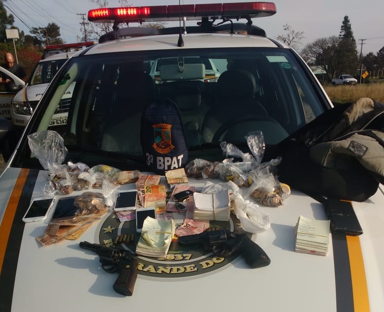 Durante a revista no veículo e passageiros, os policiais localizaram dois revólveres calibre 38 além de uma grande quantia em dinheiro roubados do mercado. Os criminosos confessaram o roubo e informaram que trocaram de veículo durante a fuga para despistar os policiais, abandonando o veículo Gm/Cruze no Bairro Alfandega, que também acabou recuperado. A quadrilha foi encaminhada ao Plantão da Polícia Civil de Garibaldi para registro e após recolhidos ao Presídio de Bento Gonçalves.