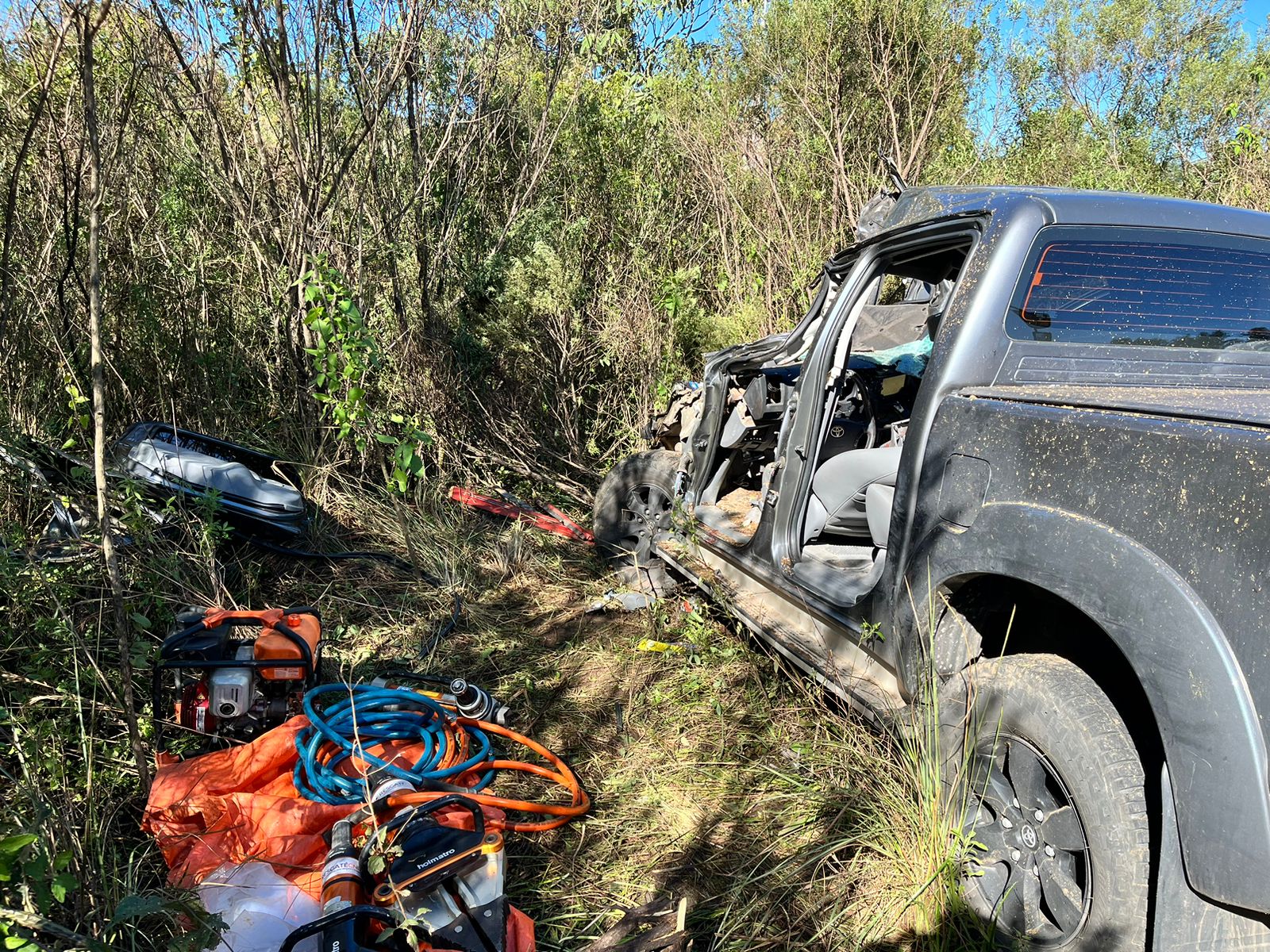 Na manhã desta sexta-feira (31), um grave acidente de trânsito mobilizou equipes de resgate na BR-116, no km 70, na localidade do Guacho, em Campestre da Serra. O Corpo de Bombeiros Militar de Vacaria atendeu a ocorrência por volta das 11h43, envolvendo uma caminhonete Hilux que saiu da pista.