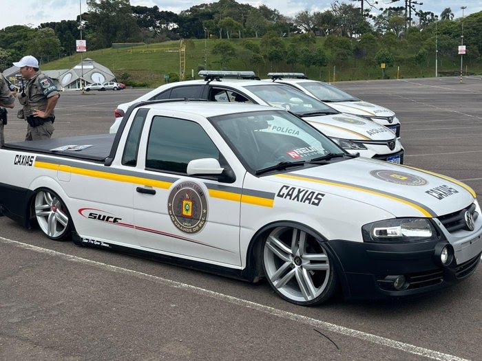 Veículo rebaixado participava de um evento nos pavilhões da Festa da Uva Uma Saveiro rebaixada foi apreendida neste domingo (13), em Caxias do Sul, o veículo participava de um evento automotivo nos pavilhões da Festa da Uva “disfarçada” de viatura da Brigada Militar.