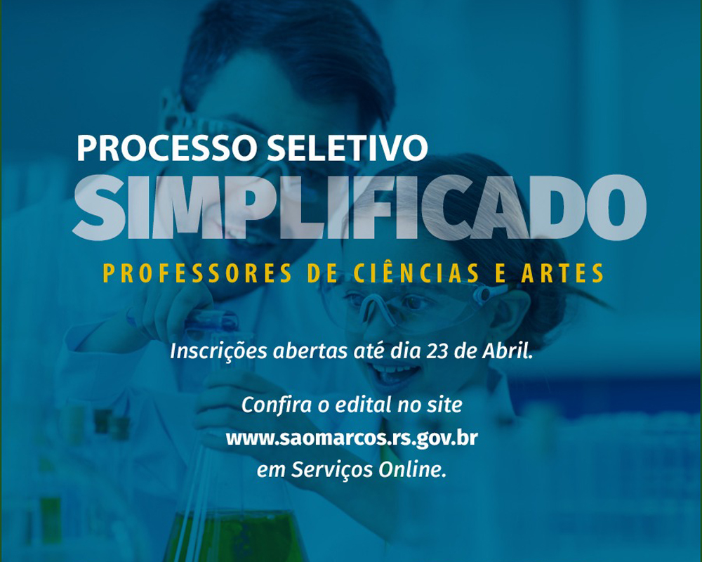 Inscrições para o Processo Seletivo Simplificado segue até terça-feira, dia 23. As vagas são para cadastros reserva na área da educação As inscrições devem ser realizadas na Secretaria de Educação (SME), no 2º andar da Prefeitura de São Marcos (Av. Venâncio Aires, 720 – Centro) até a próxima terça-feira, dia 23/04.