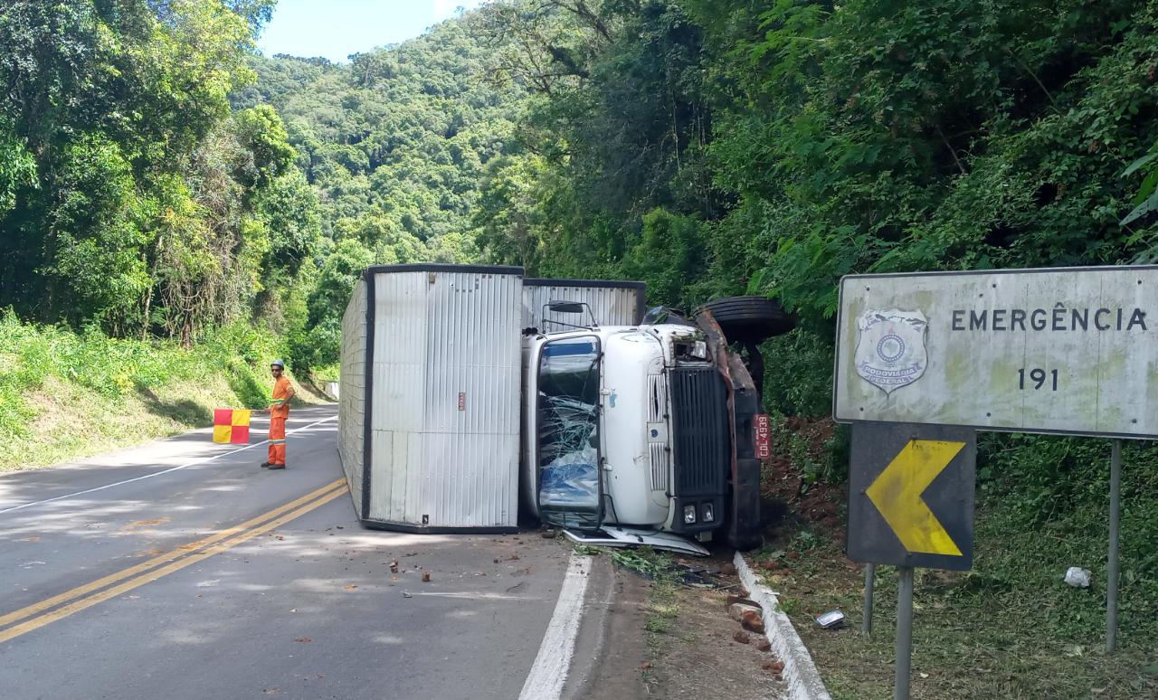 Por volta das 10h desta quinta-feira, dia 18, um caminhão baú Mercedes Benz com placas de Igrejinha/RS tombou sobre a pista no sentido Caxias do Sul, na descida da Serra do Rio São Marcos, próximo da ponte que delimita os municípios.