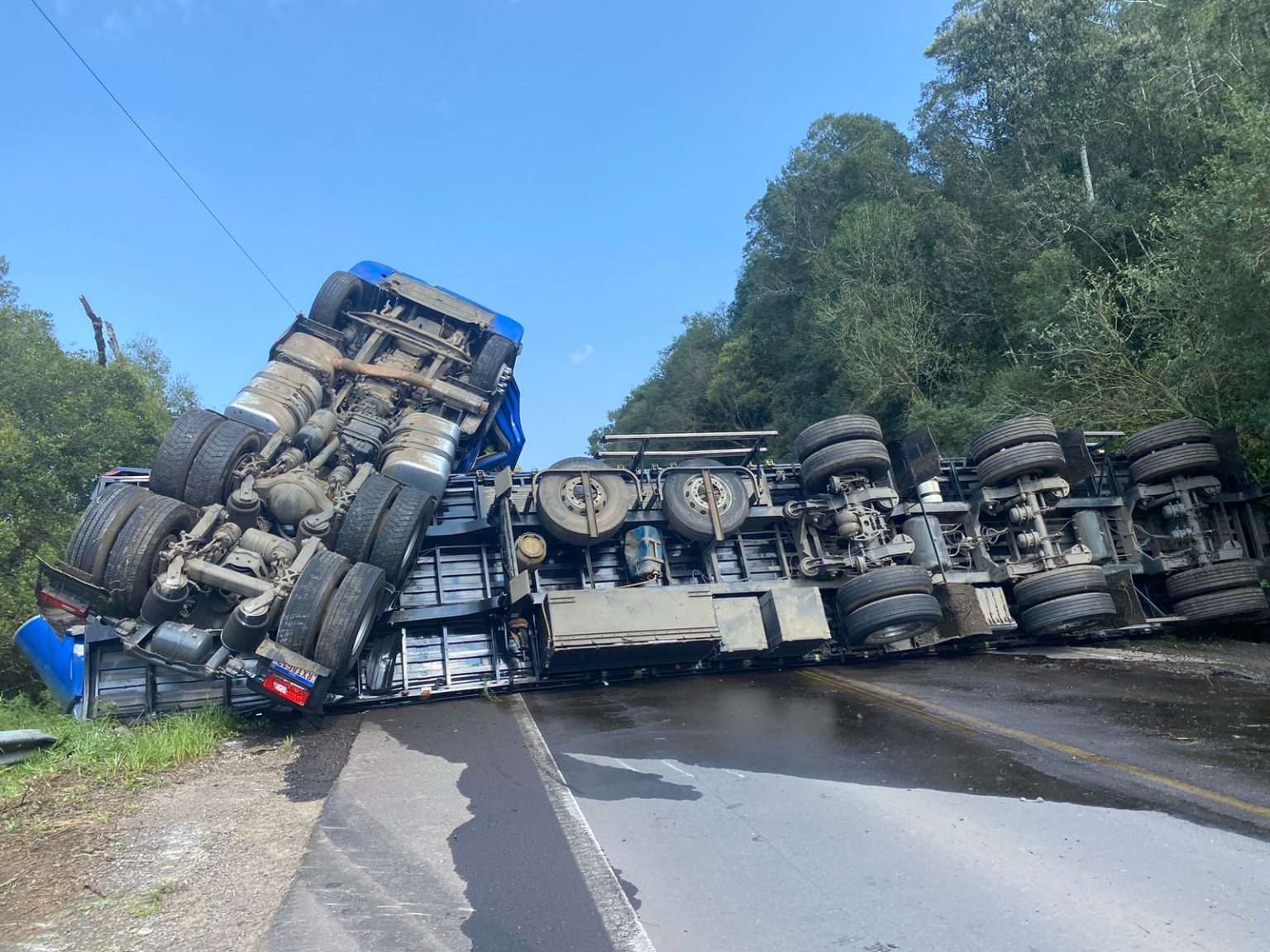 Trânsito bloqueado na Rota do Sol após tombamento de carreta, em São Francisco de Paula