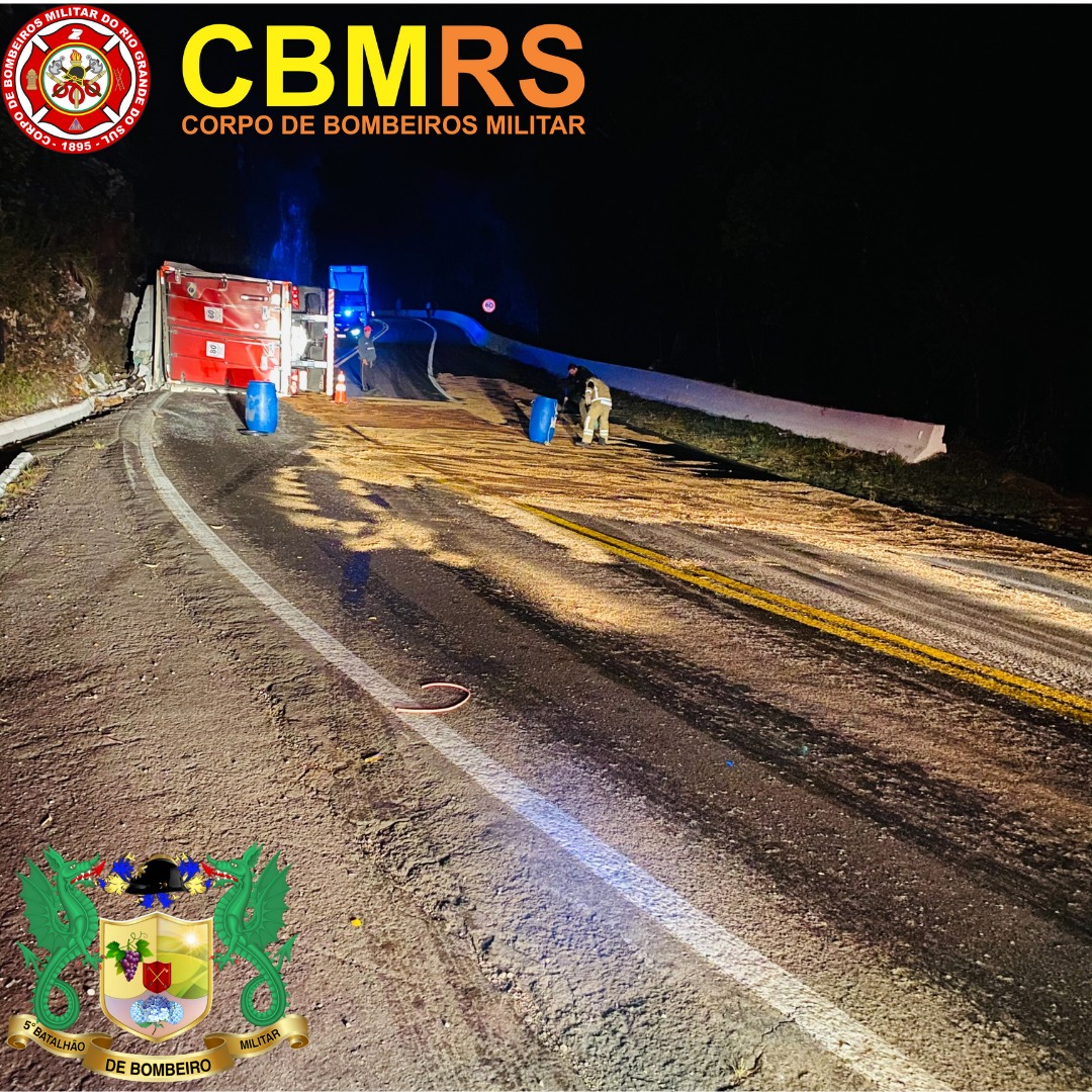 O acidente ocorreu por volta das 23h desta quarta (3) e, conforme registros do Corpo de Bombeiros Militar de São Marcos, uma carreta carregada de maçãs tombou próximo a ponte do Arroio Faxinal, na BR 116.