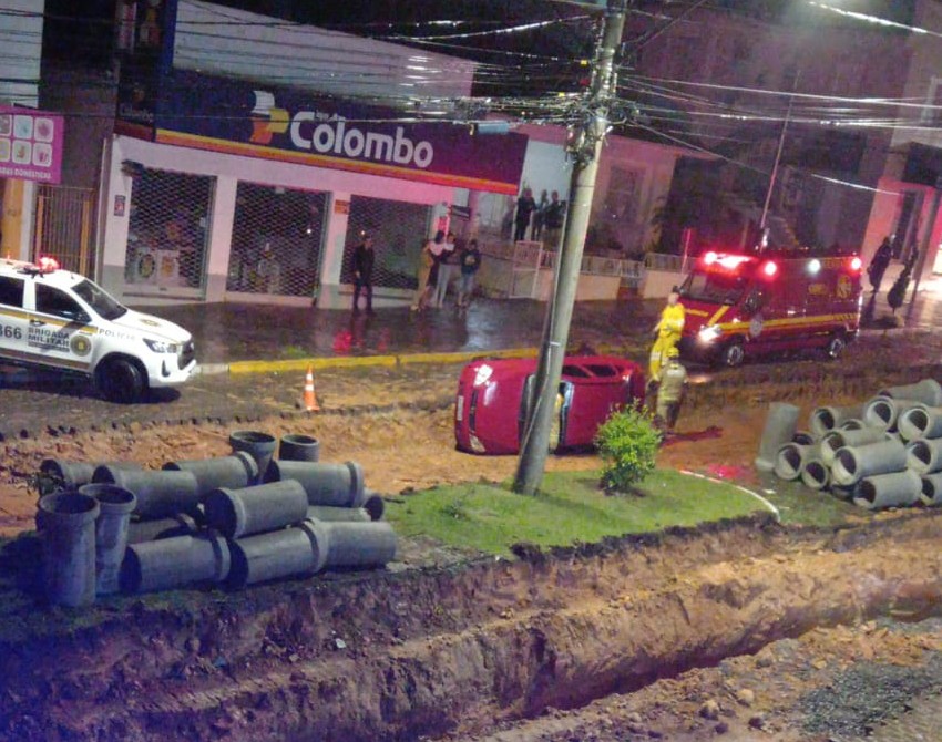 No inicio da noite deste domingo (16) o condutor de um Corsa sedan acabou caindo com o veículo na vala aberta para obras de asfaltamento que estão sendo feitas na Av. Venâncio Aires, em São Marcos.