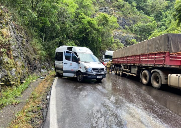 O acidente aconteceu no km 105 da rodovia estadual e envolveu uma van Mercedes-Benz Sprinter, da prefeitura de Antônio Prado, e uma carreta DAF/CF 85, com placas de Curitiba (PR).