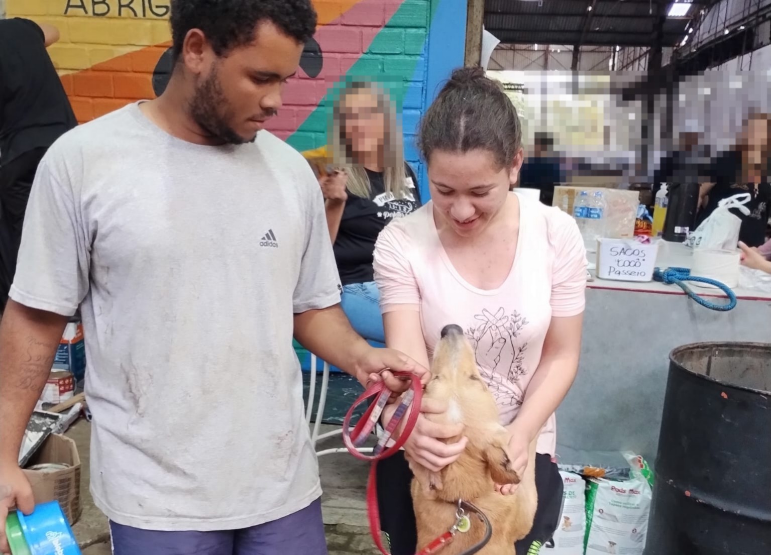 No último sábado, o Abrigo Pata Molhada recebeu a visita de centenas de tutores em busca de seus mascotes perdidos na enchente. Dumbo foi um dos sortudos. Seus tutores, Ivan e Viviane (foto), encontraram o caramelo durante a peregrinação pelos corredores do abrigo.